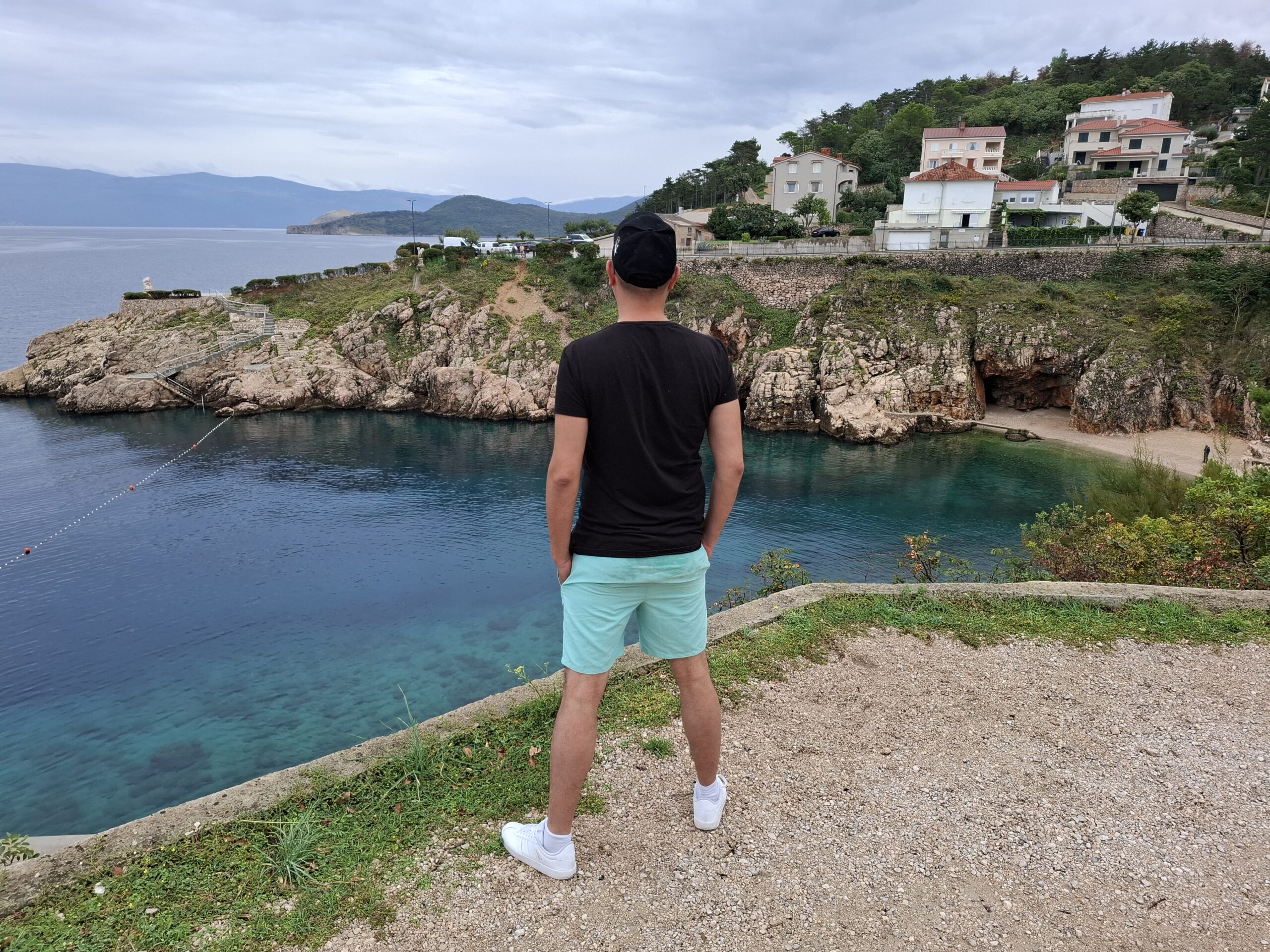 Ostatni dzień zostanie mi na dłużej w pamięci. Wstaliśmy wcześniej, aby udać się na rejs statkiem po Morzu Adriatyckim z miejscowości Krk. Wybraliśmy drewniany statek, który wyglądał tak, jakby miał już za sobą niejedną morską przygodę – skrzypiące deski, gdzieniegdzie obdrapana farba, a całość miała w sobie więcej charakteru niż wszystkie białe plastikowe łodzie razem wzięte. Frekwencja była niewielka, co mnie niezwykle cieszy – przestałem lubić tłumy. Na start dostaliśmy kubek smacznej, słodkiej śliwowicy, która delikatnie podkręciła odczucia z wycieczki. Nie czułem żadnego intensywnego zapachu morza, tylko niezwykle przyjemną bryzę i morski wiaterek otulający moje ciało naprzemiennie z promieniami słońca. Dodam tylko, że jeszcze niedawno nie czułem się zbyt dobrze na morzu – wręcz stawałem się fioletowo-zielony.